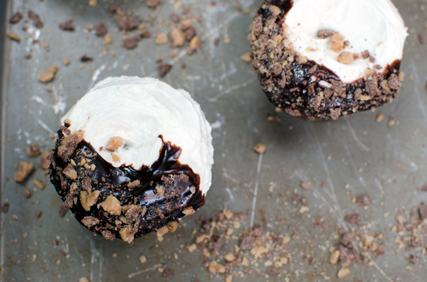 - To make the cupcake design that I used, pour the ganache on a plate and gently swirl one side of your banana bourbon cupcake upside down over the ganache.