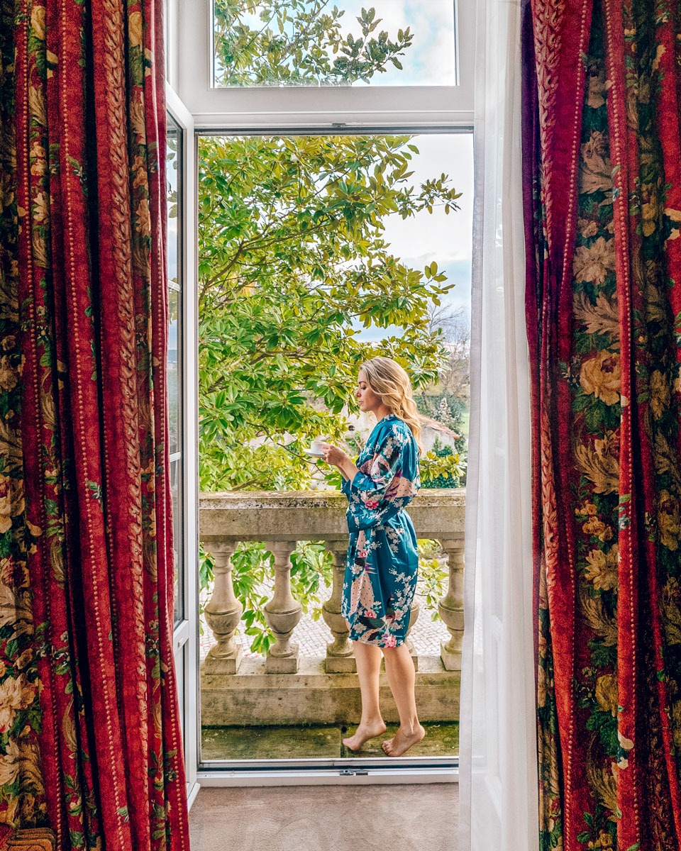 We were incredibly lucky to stay in the historic King’s Suite during our stay at Quinta das Lágrimas. This stately room has a very striking yellow and red decor in the giant bedroom. There is also a large sitting room with a balcony.