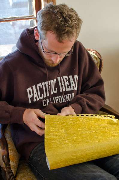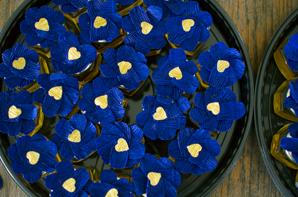 This project required all hands on deck, because even though it was simple enough, it still required cutting 300 petals out by hand. Thanks to Dad for the honey, Erica for bouncing ideas around with me, my new mother and sister-in-laws for the manpower and even Pat, who punched out all of the gold foil hearts!