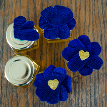 Then my brain turned to crepe paper flowers. Paper flowers are everywhere on the interwebs and I had even purchased fancy Italian crepe paper with the intention of making giant paper flowers as wedding decorations (I abandoned this idea about 5 minutes into starting it as it was a really involved project – quitter!). I googled and pinterest-ed but couldn’t find a feasible design to do on such small jars with the materials I had on hand. I ended up creating this basic flower design