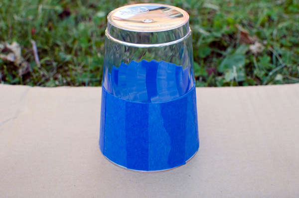 1. In order to get a tight fit, cut your painter’s tape into several 1 1/2 to 2 inch sections and press around your cup near the lip. You can vary the thickness of the painter’s tape you use to spray paint more or less of the cup.
