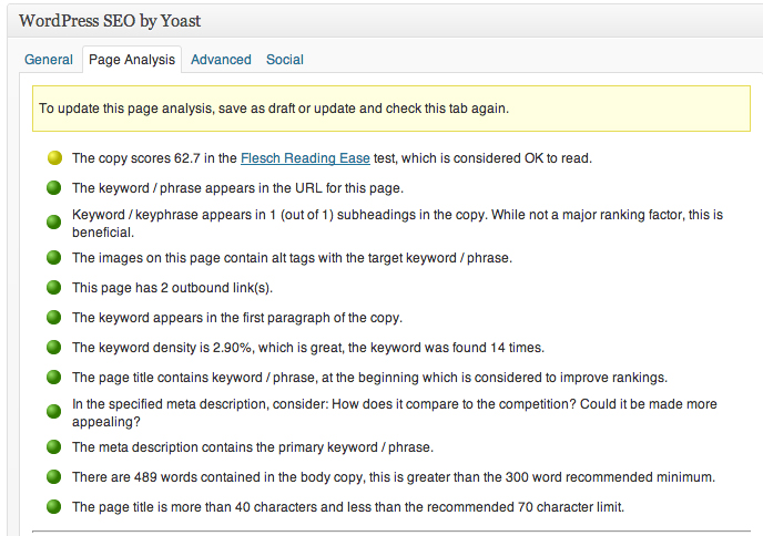 8. All of these things are summarized in the “page analysis” checklist on the WordPress Yoast SEO plugin. Your post then receives a green, yellow or red rating to determine how well your SEO optimization for that keyword is: