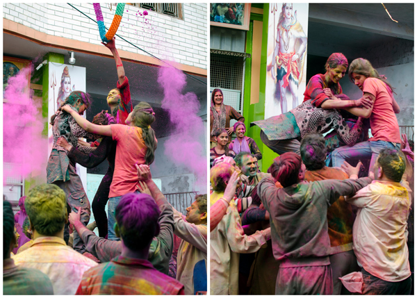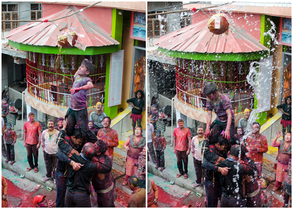 The event culminated in a crazy battle-of-the-sexes human tower competition with the aim of knocking a clay vase down from a rope that was suspended across the street. It was a bit like a pinata, and I was happy to find a safe spot on balcony to enjoy the scene. The contestants were challenged with buckets of water and large quantities of powder to distract them from their quest.
