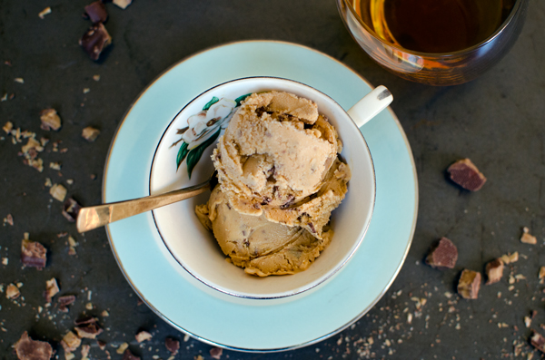 - Once chilled, pour the ice cream in an ice cream maker and churn according to the directions – typically about 20-25 minutes. About 5 minutes before finishing, add in the toffee pieces.