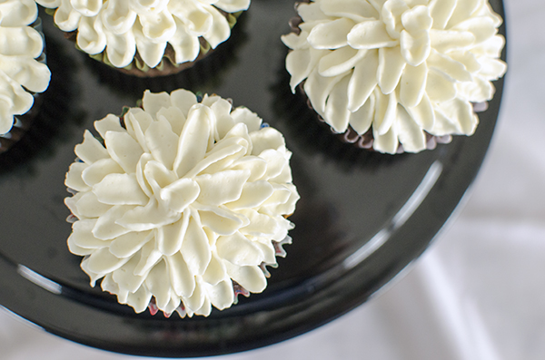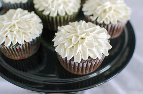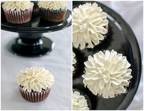 How sweet are these pretty mum cupcakes? You may remember that I am participating in a quest to find the Ultimate Chocolate Cupcake, with Stephanie from the Cupcake Project. These cupcakes were part of the 6th round of baking and I used this frosting technique to make them a little fancier than the traditional Wilton 1M swirl. I got the idea from these chrysanthemum cupcakes from Martha Stewart. Patients is definitely not a virtue I practice often, but I was still pleased with the overall result. I used a swiss meringue buttercream and I love the snowy white of the frosting against the dark chocolate cupcake. It would be fun to dye them with a little gel food coloring as well though!