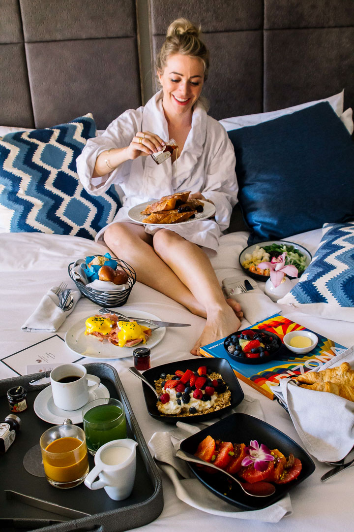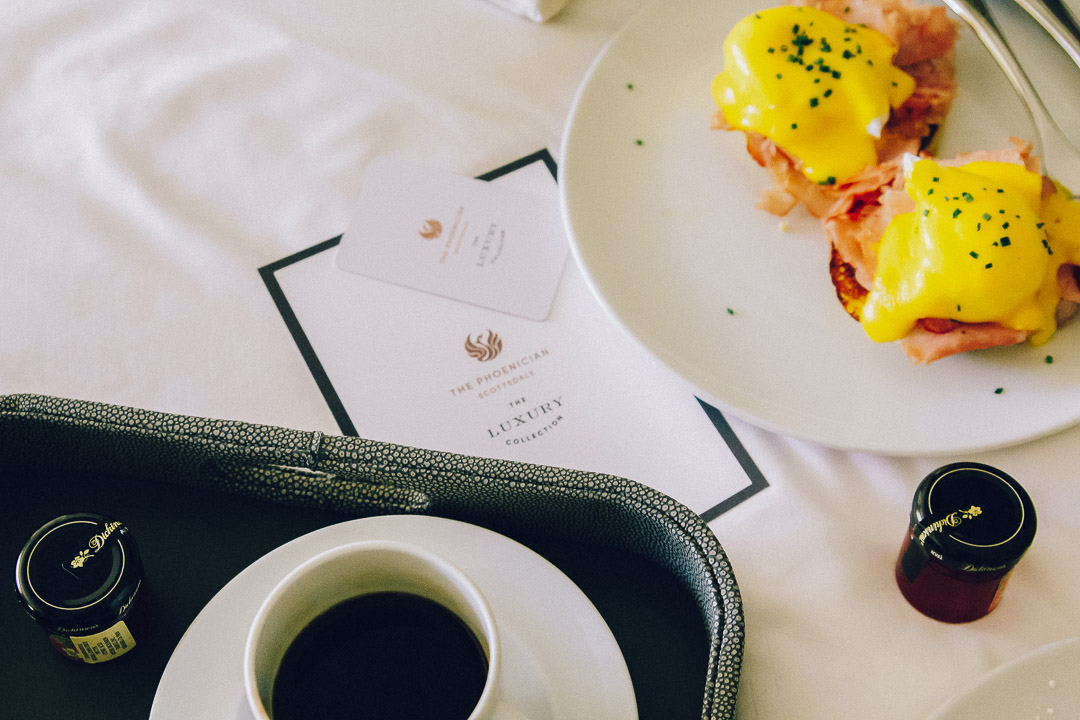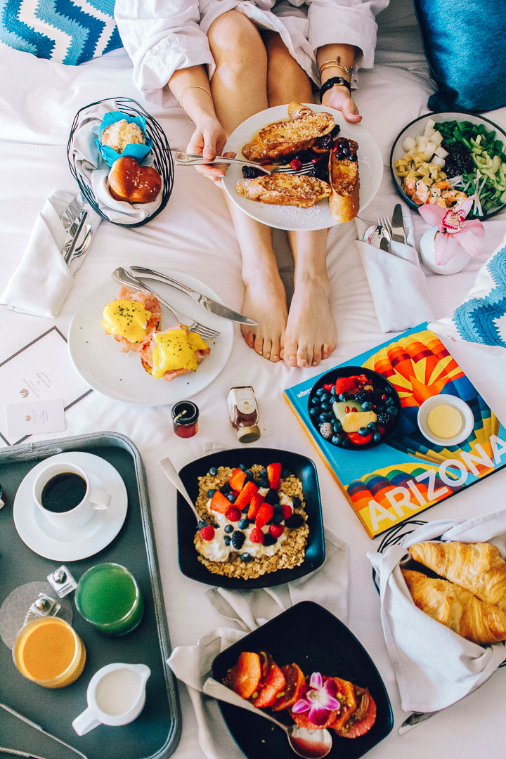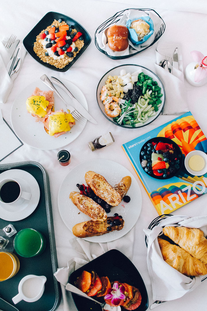 One of my favorite things about staying in a really nice hotel is taking advantage of room service! Nothing says vacation like a good ol’ breakfast in bed – especially a really comfortable king-sized bed. Room service at The Phoenician is tops. You can get all of your favorite breakfast dishes like eggs benedict and pancakes with a few surprises like a healthy quinoa salad with shrimp and a beautiful citrus plate and dates topped with pistachios. Not to mention fresh fruit, strong coffee and this amazing ‘golden elixir’ with turmeric, honey, cinnamon and almond milk.