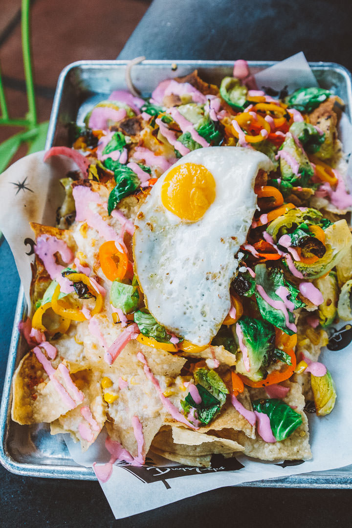 I still dream about their brussels sprout nachos and I’m dying to recreate the recipe for the blog – and my belly. TIn case you’re wondering, that beautiful pink topping you see is a delicious beet crema – the perfect finish for this healthy-not-healthy dish. From snowcone cocktails to colorful tacos, eating the rainbow has never tasted so good. The decor at Diego Pops is also on point with bright colors, fun signage and this awesome neon pineapple wallpaper.