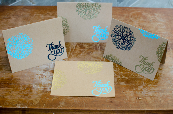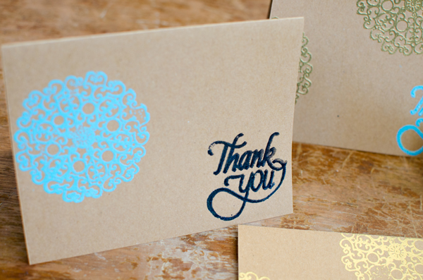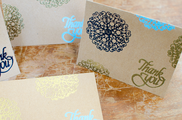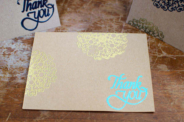 If you’ve been here long, you’ll know two things about me. 1) I love making my own greeting cards/thank you notes and 2) I emboss everything I can get my hands on. This includes, but is not limited too – my wedding save-the-dates, wedding invitations, wedding placecards, wedding menus, wedding dessert table labels and wedding envelopes. We don’t have our wedding photos back for me to share yet, but I did share the DIY embossed envelopes a while back. These easy embossed greeting cards match the envelopes in that DIY and were what I used for our thank you notes.