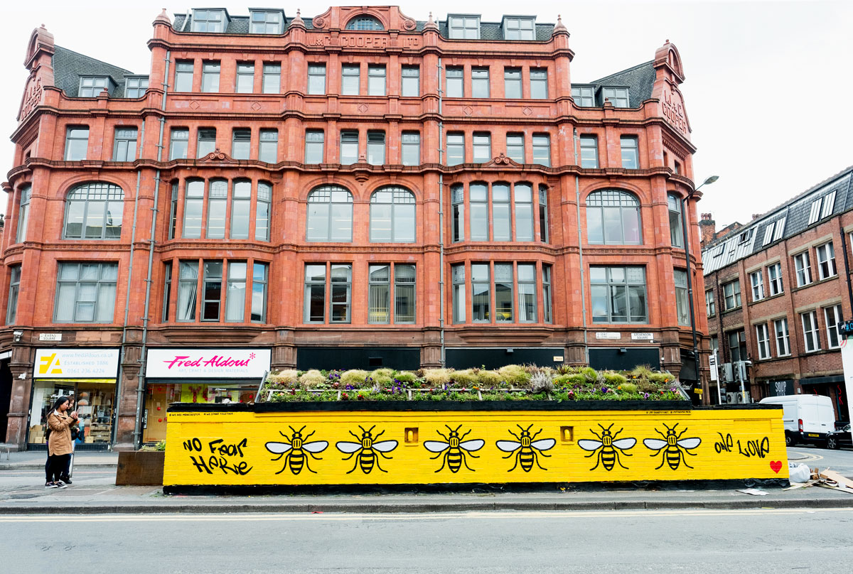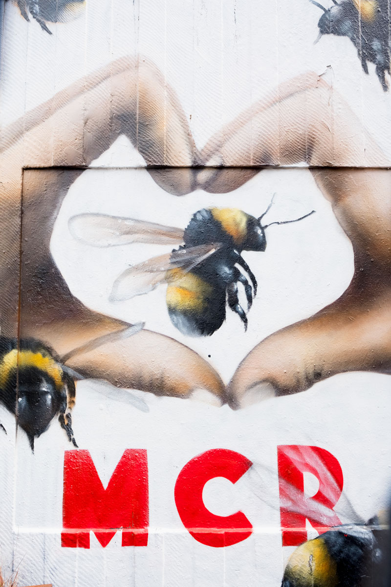 There are fabulous murals and street art everywhere in Manchester, but especially in the trendy Northern Quarter. One thing that’s popped up lately is several murals featuring the worker bee. It was adopted during the Industrial Revolution to symbolize Manchester’s role in developing mass production and Manchester being a hive of activity during that time. Now it’s also a symbol of solidarity and resilience in the time after the tragic events in May.