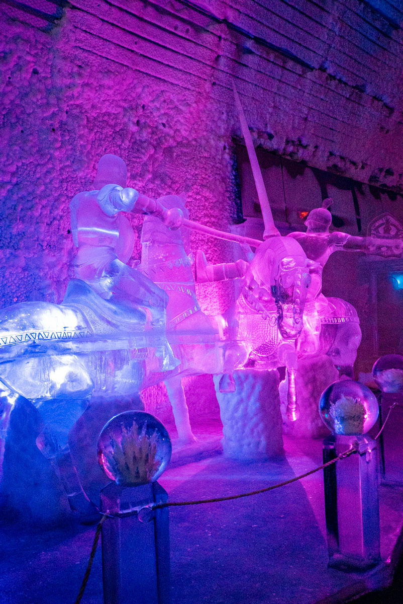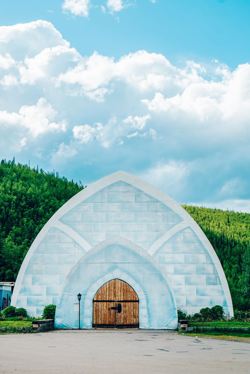 One of the strangest experiences during our trip to Fairbanks was the Ice Museum & Bar at Chena Hot Springs. A huge warehouse has been converted into a literal ice palace. The ice museum is open year-round and was created from over 1,000 tons of ice and snow harvested at the resort. The ice museum stays a cool 25° Fahrenheit year-round. The entire building is decorated with giant ice sculptures and lighted displays.