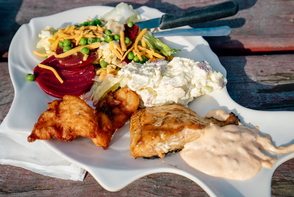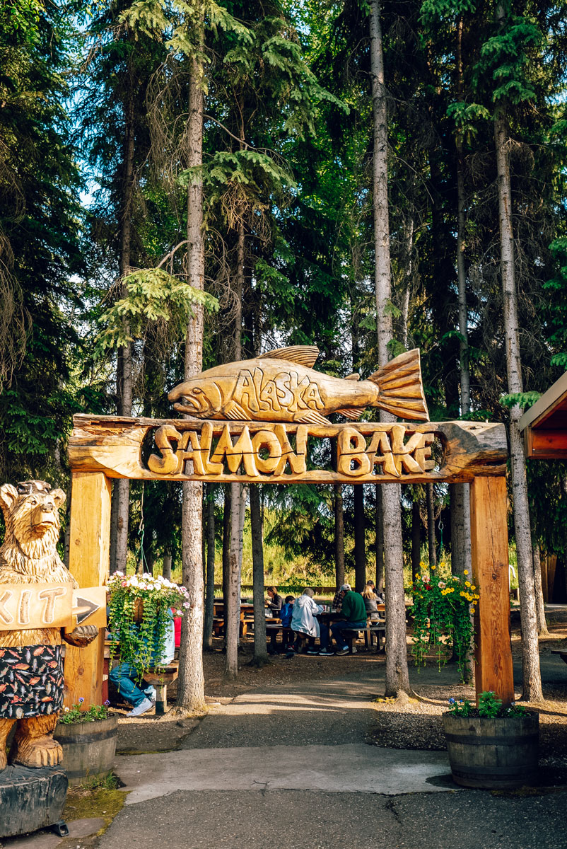 The all-you-care-to-eat Alaska Salmon Bake runs from May to September. This Fairbanks tradition was started by a 4th generation Alaskan in 1979. Many of the recipes served are the same ones that were passed down his family. Three generations of the family still work at the bake!