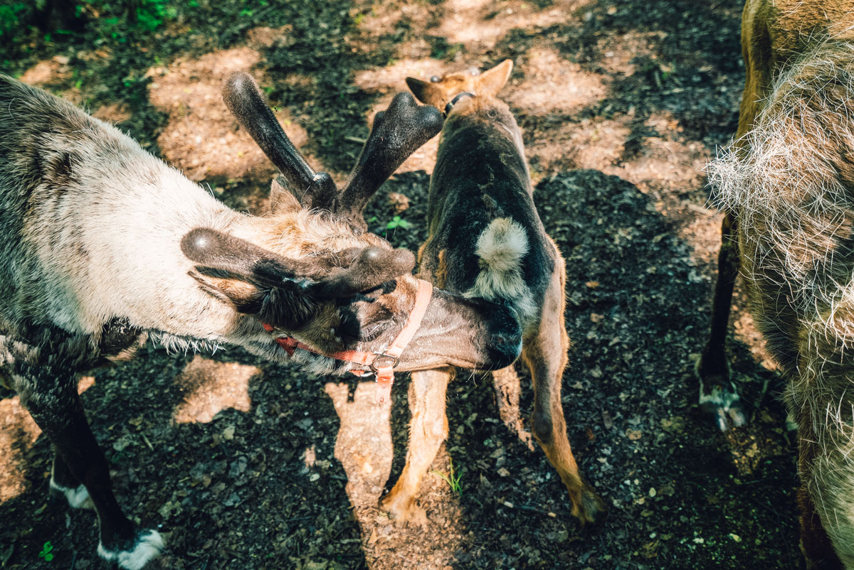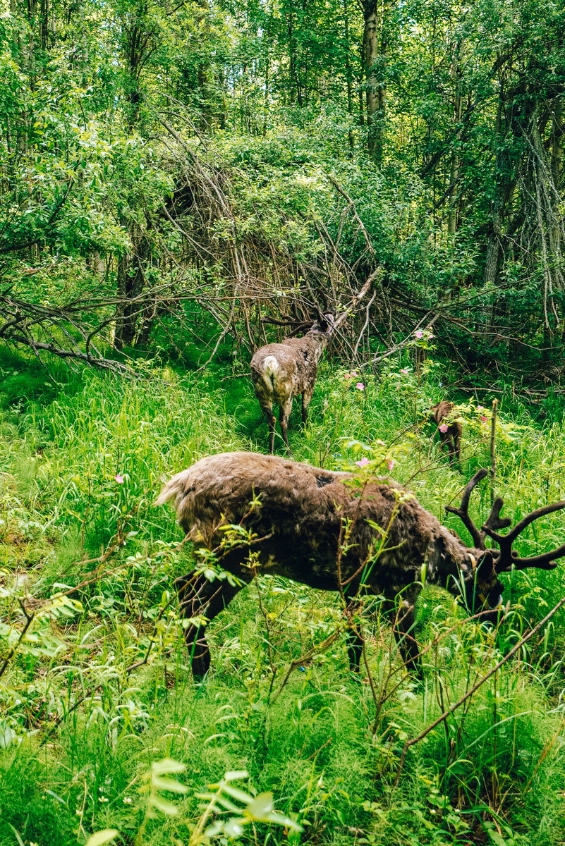 The Reindeer at Running Reindeer Ranch are pets, not food. The ranch is owned by Doug and Jane. The first reindeer started as an obsession by their daughter, who raised money to buy two reindeer for a 4-H project. She’s now grown up, but Dough and Jane continue to do reindeer walks for visitors to the ranch. You get to meet the herd and take a short walk around the property with them. The babies are shy, but most of the older reindeer were fairly tame. They were shedding their winter hair when we visited so they appreciated the huge clumps of hair being removed when they were petted. Plan on wearing comfortable shoes that you don’t mind getting muddy.